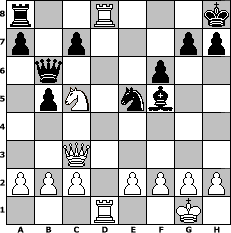 game notation in PGN-format [Event "Mal wieder spielen ?"] [Site "www.myChess.de"] [Date "2012.04.09"] [Round "1"] [White "Wulfen49"] [Black "borsti"] [ECO "C44"] [WhitemyELO "1307"] [BlackmyELO "1200"] [Result "1-0"] [TimeControl "10/2592000"] [WhiteDays "75"] [BlackDays "90"] [MyChessNo "81010"] 1. e4 e5 2. Nf3 Nc6 3. d4 Nxd4 4. Nxd4 exd4 5. Qxd4 Qf6 6. e5 Qe6 7. Bc4 Qc6 8. Qf4 Nh6 9. O-O Bc5 10. Be3 d5 11. Bxc5 Qxc5 12. Bb3 Bf5 13. Nc3 d4 14. Na4 Qe7 15. Qxd4 O-O 16. Rfe1 Kh8 17. Qf4 Qd7 18. Nc5 Qc6 19. Qe3 Rfe8 20. Rad1 f6 21. Rd2 Re7 22. Ba4 b5 23. Bb3 Ng4 24. Qc3 Nxe5 25. Red1 Ree8 26. Bd5 Qb6 27. Bxa8 Rxa8 28. Rd8+ 1-0 position notation in FEN-format r2R3k/p1p3pp/1q3p2/1pN1nb2/8/2Q5/PPP1PPPP/3R2K1 - - - 1 28 Captured white pieces: ![]() ![]() ![]() ![]() ![]() ![]() ![]() ![]() ![]() ![]() ![]() ![]() ![]() ![]() ![]() Captured black pieces: ![]() ![]() ![]() ![]() ![]() ![]() ![]() ![]() ![]() ![]() ![]() ![]() ![]() ![]() ![]() Click on a captured piece in order to display the desired move!
