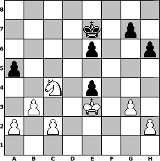 game notation in PGN-format [Event "M"] [Site "www.myChess.de"] [Date "2014.05.10"] [Round "1"] [White "Wernburger"] [Black "Joschi"] [ECO "A16"] [WhitemyELO "1806"] [BlackmyELO "1529"] [Result "1-0"] [TimeControl "10/3456000"] [WhiteDays "40"] [BlackDays "40"] [MyChessNo "94352"] 1. c4 Nf6 2. Nc3 c5 3. g3 Nc6 4. Bg2 e6 5. e4 d6 6. Nge2 Be7 7. O-O O-O 8. d4 cxd4 9. Nxd4 a6 10. Nxc6 bxc6 11. e5 dxe5 12. Bxc6 Rb8 13. b3 Bb7 14. Bxb7 Rxb7 15. Qf3 Rd7 16. Be3 Rd3 17. Rfd1 Rxd1+ 18. Rxd1 Qa5 19. Bg5 h6 20. Bxf6 Bxf6 21. Rd7 Rd8 22. Rxd8+ Qxd8 23. c5 Qc7 24. Qa8+ Kh7 25. c6 a5 26. Nb5 Qd8 27. Qxd8 Bxd8 28. c7 Bxc7 29. Nxc7 Kg6 30. Ne8 f5 31. f3 Kf7 32. Nd6+ Kf6 33. Kf2 Ke7 34. Nc4 e4 35. fxe4 fxe4 36. Ke3 1-0 position notation in FEN-format 8/4k1p1/4p2p/p7/2N1p3/1P2K1P1/P1P4P/8 - - - 1 36 Captured white pieces: Captured black pieces: Click on a captured piece in order to display the desired move!
