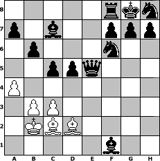 game notation in PGN-format [Event "960er Sommer Turnier"] [Site "www.myChess.de"] [Date "2006.05.20"] [Round "2"] [White "MichaelKnopf"] [Black "wasserandy"] [Variant "Fischerrandom"] [SetUp "1"] [FEN "qbrkbrnn/pppppppp/8/8/8/8/PPPPPPPP/QBRKBRNN w KQkq - 0 1"] [WhitemyELO "1522"] [BlackmyELO "1817"] [Result "0-1"] [TimeControl "10/864000"] [WhiteDays "10"] [BlackDays "10"] [MyChessNo "25611"] 1. b3 Nf6 2. f3 c6 3. g3 d5 4. c3 Bd7 5. a4 b6 6. Bf2 O-O 7. e3 e5 8. Be1 Rce8 9. Nf2 c5 10. Bc2 e4 11. f4 Bc7 12. h3 Qc8 13. d3 exd3 14. Bb1 Rxe3 15. Kd2 Rxg3 16. Nxd3 Rg2+ 17. Kd1 Bxh3 18. Rc2 Qg4+ 19. Nf3 Rxc2 20. Bxc2 Bxf1 21. Kc1 Qxf3 22. Ne5 Qxf4+ 23. Bd2 Qxe5 24. Kb2 Bh3 25. Qf1 Bxf1 0-1 position notation in FEN-format 5rkn/p1b2ppp/1p3n2/2ppq3/P7/1PP5/1KBB4/5b2 - - - 0 26 Captured white pieces: Captured black pieces: Click on a captured piece in order to display the desired move!