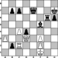 game notation in PGN-format [Event "1600_er unter sich"] [Site "www.myChess.de"] [Date "2005.04.06"] [Round "1"] [White "Armin1960"] [Black "Andreas"] [ECO "C42"] [WhitemyELO "1640"] [BlackmyELO "1619"] [Result "0-1"] [TimeControl "10/864000"] [WhiteDays "09"] [BlackDays "10"] [MyChessNo "11829"] 1. e4 e5 2. Nf3 Nf6 3. d3 Nc6 4. Nc3 Bc5 5. h3 O-O 6. Be2 h6 7. O-O d5 8. exd5 Nxd5 9. Nxd5 Qxd5 10. c3 f5 11. b3 Be6 12. Bb2 Rad8 13. c4 Qd6 14. a3 a5 15. Re1 g5 16. Nh2 Nd4 17. Bh5 Nc6 18. Nf3 g4 19. hxg4 fxg4 20. d4 gxf3 21. dxc5 Qxc5 22. Qc1 Kh7 23. Bxf3 Rxf3 24. gxf3 Rg8+ 25. Kf1 a4 26. Qc2+ Rg6 27. Qe4 axb3 28. Rac1 Nd4 29. Bxd4 exd4 30. Qd3 b2 31. Rc2 Bf5 32. Re7+ Qxe7 0-1 position notation in FEN-format 8/1pp1q2k/6rp/5b2/2Pp4/P2Q1P2/1pR2P2/5K2 - - - 0 33 Captured white pieces: ![]() ![]() ![]() ![]() ![]() ![]() ![]() ![]() ![]() ![]() ![]() ![]() ![]() ![]() ![]() Captured black pieces: ![]() ![]() ![]() ![]() ![]() ![]() ![]() ![]() ![]() ![]() ![]() ![]() ![]() ![]() ![]() Click on a captured piece in order to display the desired move!