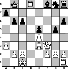 game notation in PGN-format [Event "wie w"] [Site "www.myChess.de"] [Date "2013.11.16"] [Round "1"] [White "Winston"] [Black "lotchi"] [ECO "C20"] [WhitemyELO "1550"] [BlackmyELO "1175"] [Result "1-0"] [TimeControl "10/1728000"] [WhiteDays "20"] [BlackDays "14"] [MyChessNo "91141"] 1. e4 e5 2. a3 d5 3. exd5 Qxd5 4. Nc3 Qd6 5. Qf3 f6 6. Nge2 Nc6 7. Ng3 g6 8. Bb5 Bd7 9. d3 O-O-O 10. Be3 h6 11. Nge4 Qe7 12. Nd5 Qf7 13. Bc4 f5 14. Nb6+ cxb6 15. Bxf7 fxe4 16. dxe4 g5 17. O-O-O Be8 18. Be6+ Bd7 19. Bxd7+ Kb8 20. Bxc6 bxc6 21. Rxd8+ 1-0 position notation in FEN-format 1k1R1bnr/p7/1pp4p/4p1p1/4P3/P3BQ2/1PP2PPP/2K4R - - - 0 21 Captured white pieces: Captured black pieces: Click on a captured piece in order to display the desired move!