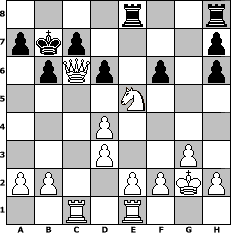 game notation in PGN-format [Event ""Gehirn Jogging A""] [Site "www.myChess.de"] [Date "2010.04.28"] [Round "1"] [White "reisender"] [Black "bluescreenlover"] [ECO "B00"] [WhitemyELO "1406"] [BlackmyELO "1288"] [Result "1-0"] [TimeControl "10/1728000"] [WhiteDays "20"] [BlackDays "15"] [MyChessNo "65107"] 1. e4 b6 2. g3 Bb7 3. Bg2 e5 4. Nf3 Bxe4 5. O-O Qe7 6. d3 Bb7 7. Nxe5 Bxg2 8. Kxg2 d6 9. Nf3 Qd7 10. Re1+ Be7 11. Nc3 Nh6 12. Nd5 Nc6 13. Bg5 f6 14. Bxh6 gxh6 15. c3 O-O-O 16. Nd4 Nxd4 17. cxd4 Qc6 18. Qf3 Rde8 19. Rac1 Qd7 20. Nxe7+ Kb8 21. Nc6+ Kb7 22. Ne5+ Qc6 23. Qxc6+ 1-0 position notation in FEN-format 4r2r/pkp4p/1pQp1p1p/4N3/3P4/3P2P1/PP2PPKP/2R1R3 - - - 0 23 Captured white pieces: Captured black pieces: Click on a captured piece in order to display the desired move!