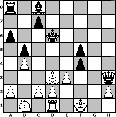 game notation in PGN-format [Event "10. HK-Turnier"] [Site "www.myChess.de"] [Date "2009.08.06"] [Round "1"] [White "Haneken"] [Black "ujack1961"] [ECO "A00"] [WhitemyELO "1534"] [BlackmyELO "1645"] [Result "0-1"] [TimeControl "10/2592000"] [WhiteDays "27"] [BlackDays "30"] [MyChessNo "58080"] 1. Nc3 d5 2. Nf3 d4 3. Ne4 f5 4. Neg5 h6 5. Nh3 g5 6. e3 g4 7. Nxd4 e5 8. Nb5 a6 9. N5c3 gxh3 10. Qh5+ Ke7 11. Bc4 Nf6 12. Qf7+ Kd6 13. gxh3 Rh7 14. Qg6 Rg7 15. Qxh6 Rg1+ 16. Rxg1 Bxh6 17. Rg6 Qf8 18. f4 exf4 19. Nd5 Nbd7 20. b4 b5 21. Nxf6 Nxf6 22. Bb2 Bg7 23. Bxf6 Bxf6 24. Bd3 Qf7 25. Rh6 Qg7 26. Rxf6+ Qxf6 27. Rd1 Qh4+ 28. Kf1 Qxh3+ 0-1 position notation in FEN-format r1b5/2p5/p2k4/1p3p2/1P3p2/3BP2q/P1PP3P/1N1R1K2 - - - 0 29 Captured white pieces: Captured black pieces: Click on a captured piece in order to display the desired move!