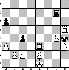 game notation in PGN-format [Event "und immer wieder Schach !"] [Site "www.myChess.de"] [Date "2009.11.06"] [Round "1"] [White "Andreas"] [Black "Ostseeboy"] [ECO "B32"] [WhitemyELO "1519"] [BlackmyELO "1202"] [Result "1-0"] [TimeControl "10/864000"] [WhiteDays "35"] [BlackDays "40"] [MyChessNo "60390"] 1. e4 c5 2. Nf3 Nc6 3. d4 e6 4. d5 Nb4 5. a3 Na6 6. Bxa6 bxa6 7. dxe6 dxe6 8. Qxd8+ Kxd8 9. Ne5 Nf6 10. Nxf7+ Ke7 11. Nxh8 g6 12. Bg5 Bg7 13. Nxg6+ hxg6 14. e5 Kf7 15. exf6 Bxf6 16. Bxf6 Kxf6 17. Nc3 Bb7 18. f3 Rd8 19. Rd1 Re8 20. Ne4+ Bxe4 21. fxe4 Ke5 22. Rf1 Rh8 23. h3 Kxe4 24. Rf6 Ke5 25. Rxg6 Kf5 26. Rg7 e5 27. Rxa7 Rh6 28. Rd5 c4 29. Re7 Kf4 30. Rexe5 Rg6 31. g4 Kg3 32. Re3+ Kh4 33. Rc5 Rg7 34. Rh5# 1-0 position notation in FEN-format 8/6r1/p7/7R/2p3Pk/P3R2P/1PP1P3/4K3 - - - 6 34 Captured white pieces: Captured black pieces: Click on a captured piece in order to display the desired move!