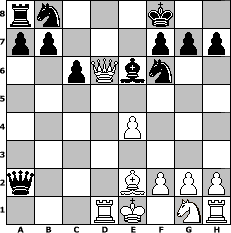 game notation in PGN-format [Event "f"] [Site "www.myChess.de"] [Date "2005.12.25"] [Round "1"] [White "Caligula"] [Black "Whiskey40"] [ECO "D10"] [WhitemyELO "1273"] [BlackmyELO "1522"] [Result "1-0"] [TimeControl "10/864000"] [WhiteDays "10"] [BlackDays "04"] [MyChessNo "21138"] 1. d4 d5 2. c4 c6 3. cxd5 Qxd5 4. Nc3 Qa5 5. Qa4 Qh5 6. d5 Bd7 7. Qd4 Nf6 8. e4 e5 9. dxe6 Bxe6 10. Be2 Qa5 11. b4 Bxb4 12. Bd2 Bxc3 13. Bxc3 Qa3 14. Rd1 O-O 15. Bb4 Qxa2 16. Bxf8 Kxf8 17. Qd6+ 1-0 position notation in FEN-format rn3k2/pp3ppp/2pQbn2/8/4P3/8/q3BPPP/3RK1NR - K - 1 17 Captured white pieces: Captured black pieces: Click on a captured piece in order to display the desired move!