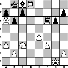 game notation in PGN-format [Event "3. HSF-Clubturnier - A-Finale"] [Site "www.myChess.de"] [Date "2013.03.16"] [Round "1"] [White "leitsgeheier"] [Black "reisender"] [ECO "A40"] [WhitemyELO "1608"] [BlackmyELO "1364"] [Result "1-0"] [TimeControl "10/2592000"] [WhiteDays "30"] [BlackDays "30"] [MyChessNo "87165"] 1. d4 b6 2. e4 Bb7 3. Bd3 d5 4. e5 e6 5. Nf3 Nc6 6. O-O Qd7 7. a3 O-O-O 8. Be3 f6 9. c4 f5 10. Qc2 dxc4 11. Bxc4 g6 12. Ng5 Nh6 13. Bxe6 Kb8 14. Bxd7 Rxd7 15. Ne6 Ng4 16. Nxf8 Rxf8 17. Rd1 Nxe3 18. fxe3 f4 19. e6 Re7 20. d5 Nd8 21. e4 f3 22. Rf1 Nxe6 23. dxe6 Rxe6 24. gxf3 Rc6 25. Nc3 Ba6 26. Rf2 Rd8 27. Qa4 Bb7 28. Rd1 Rg8 29. Rfd2 Rf6 30. Rd8+ Rxd8 31. Rxd8+ Bc8 32. Qa6 1-0 position notation in FEN-format 1kbR4/p1p4p/Qp3rp1/8/4P3/P1N2P2/1P5P/6K1 - - - 2 32 Captured white pieces: ![]() ![]() ![]() ![]() ![]() ![]() ![]() ![]() ![]() ![]() ![]() ![]() ![]() ![]() ![]() Captured black pieces: ![]() ![]() ![]() ![]() ![]() ![]() ![]() ![]() ![]() ![]() ![]() ![]() ![]() ![]() ![]() Click on a captured piece in order to display the desired move!