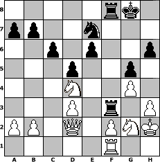 game notation in PGN-format [Event "Dabei ist alles 2"] [Site "www.myChess.de"] [Date "2008.04.04"] [Round "1"] [White "ujack1961"] [Black "Andylein1989"] [ECO "B10"] [WhitemyELO "1693"] [BlackmyELO "1411"] [Result "1-0"] [TimeControl "10/864000"] [WhiteDays "10"] [BlackDays "10"] [MyChessNo "44057"] 1. e4 c6 2. e5 d5 3. d4 Bf5 4. Nf3 e6 5. Bd3 Bxd3 6. cxd3 Bb4+ 7. Nc3 Nd7 8. Bd2 Ne7 9. O-O O-O 10. h3 Nf5 11. Rc1 Qb6 12. Ne2 Bxd2 13. Qxd2 h6 14. g4 Ne7 15. Ng3 f6 16. Kh2 Rf7 17. Rce1 Raf8 18. exf6 Rxf6 19. Nh4 Qxd4 20. Re3 g5 21. Ng2 Ne5 22. Ne2 Nf3+ 23. Rxf3 Rxf3 24. Nxd4 1-0 position notation in FEN-format 5rk1/pp2n3/2p1p2p/3p2p1/3N2P1/3P1r1P/PP1Q1PNK/5R2 - - - 0 24 Captured white pieces: Captured black pieces: Click on a captured piece in order to display the desired move!