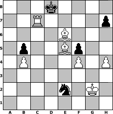 game notation in PGN-format [Event "3. Norderstedter DENK MAL Open 2012"] [Site "www.myChess.de"] [Date "2012.02.08"] [Round "1"] [White "Hobbykegler"] [Black "borsti"] [ECO "A20"] [WhitemyELO "1005"] [BlackmyELO "1222"] [Result "1-0"] [TimeControl "10/2592000"] [WhiteDays "30"] [BlackDays "30"] [MyChessNo "79812"] 1. c4 e5 2. Qc2 Nf6 3. Nc3 Nc6 4. Nf3 Bc5 5. g3 d6 6. Bg2 Be6 7. b3 Ng4 8. Ne4 f5 9. Nxc5 dxc5 10. O-O Nd4 11. Nxd4 Qxd4 12. Bb2 Qd6 13. f4 exf4 14. gxf4 c6 15. Rad1 Rg8 16. h3 Nh6 17. d4 O-O-O 18. dxc5 Qxc5+ 19. Kh1 b5 20. Qc3 Nf7 21. b4 Qxc4 22. Rxd8+ Rxd8 23. Qxc4 Bxc4 24. Bxg7 Rd6 25. a3 Rd2 26. Bxc6 Rxe2 27. Rc1 a6 28. a4 Kc7 29. axb5 Nd6 30. Be5 Re4 31. Bxe4 axb5 32. Bd3 Kb6 33. Bxc4 Ne4 34. Bd4+ Kc6 35. Bb3+ Kd6 36. h4 Ng3+ 37. Kg2 Ne2 38. Be5+ Kd7 39. Rc7+ Kd8 40. Be6 1-0 position notation in FEN-format 3k4/2R4p/4B3/1p2Bp2/1P3P1P/8/4n1K1/8 - - - 8 40 Captured white pieces: ![]() ![]() ![]() ![]() ![]() ![]() ![]() ![]() ![]() ![]() ![]() ![]() ![]() ![]() ![]() Captured black pieces: ![]() ![]() ![]() ![]() ![]() ![]() ![]() ![]() ![]() ![]() ![]() ![]() ![]() ![]() ![]() Click on a captured piece in order to display the desired move!
