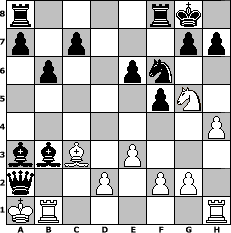 game notation in PGN-format [Event "Tigran (Wartanowitsch)Petrosjan Turnier"] [Site "www.myChess.de"] [Date "2009.08.09"] [Round "1"] [White "Hobbykegler"] [Black "Papale"] [ECO "A13"] [WhitemyELO "1093"] [BlackmyELO "1733"] [Result "0-1"] [TimeControl "10/2592000"] [WhiteDays "55"] [BlackDays "59"] [MyChessNo "58170"] 1. c4 e6 2. b3 f5 3. Bb2 Nf6 4. Na3 Be7 5. Qc2 O-O 6. Nf3 b6 7. O-O-O Bb7 8. Ng5 Na6 9. e3 Nb4 10. Qc3 Nxa2+ 11. Kb1 Nxc3+ 12. Bxc3 Bxa3 13. Bd3 d5 14. cxd5 Bxd5 15. h4 Bxb3 16. Rde1 Qxd3+ 17. Ka1 Qc2 18. Rb1 Qa2# 0-1 position notation in FEN-format r4rk1/p1p3pp/1p2pn2/5pN1/7P/bbB1P3/q2P1PP1/KR5R - - - 4 19 Captured white pieces: Captured black pieces: Click on a captured piece in order to display the desired move!