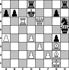 game notation in PGN-format [Event "Auf bessere Zeiten!!"] [Site "www.myChess.de"] [Date "2020.05.07"] [Round "1"] [White "S04boy"] [Black "wolni55"] [ECO "D02"] [WhitemyELO "1282"] [BlackmyELO "1384"] [Result "1-0"] [TimeControl "10/864000"] [WhiteDays "29"] [BlackDays "28"] [MyChessNo "118245"] 1. d4 d5 2. Nf3 Bf5 3. Nc3 e6 4. h3 Nc6 5. Ne5 Qd6 6. Bf4 Nxe5 7. Bxe5 Qc6 8. g4 Bg6 9. Bg2 h5 10. a4 Bb4 11. O-O Bxc3 12. bxc3 hxg4 13. hxg4 f6 14. Bg3 Qxc3 15. e3 O-O-O 16. Rc1 Nh6 17. Bf4 Qa3 18. c4 dxc4 19. Rxc4 c6 20. g5 fxg5 21. Rc3 Qe7 22. Be5 g4 23. Bf4 Qh4 24. Qb3 Bf7 25. Bg3 Qh5 26. Rfc1 Be8 27. Rxc6+ Bxc6 28. Rxc6+ Kd7 29. Qxe6# 1-0 position notation in FEN-format 3r3r/pp1k2p1/2R1Q2n/7q/P2P2p1/4P1B1/3P1PB1/6K1 - - - 0 29 Captured white pieces: Captured black pieces: Click on a captured piece in order to display the desired move!