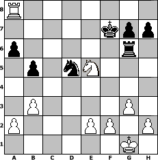 game notation in PGN-format [Event "Bauer56-Turnier-2"] [Site "www.myChess.de"] [Date "2012.02.21"] [Round "1"] [White "squeezer"] [Black "Knight"] [ECO "C68"] [WhitemyELO "1489"] [BlackmyELO "1270"] [Result "1-0"] [TimeControl "10/2592000"] [WhiteDays "080"] [BlackDays "119"] [MyChessNo "80109"] 1. e4 e5 2. Nf3 Nc6 3. Bb5 a6 4. Bxc6 dxc6 5. Nxe5 Qd4 6. Nf3 Qb6 7. O-O Nf6 8. d4 c5 9. e5 Nd5 10. dxc5 Qxc5 11. Bg5 Be7 12. c4 Qxc4 13. b3 Qc6 14. Nbd2 O-O 15. Ne4 Bf5 16. Rc1 Qe6 17. Bxe7 Nxe7 18. Neg5 Qh6 19. Rxc7 Rfe8 20. Re1 b5 21. e6 fxe6 22. Qd6 Qf6 23. Nxe6 Rad8 24. Qe5 Qxe6 25. Qxe6+ Bxe6 26. Rxe6 Nd5 27. Rxe8+ Rxe8 28. Ra7 Re6 29. g3 Rg6 30. Ra8+ Kf7 31. Ne5+ 1-0 position notation in FEN-format R7/5kpp/p5r1/1p1nN3/8/1P4P1/P3PP1P/6K1 - - - 4 31 Captured white pieces: Captured black pieces: Click on a captured piece in order to display the desired move!