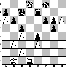 game notation in PGN-format [Event "Bremer Schl"] [Site "www.myChess.de"] [Date "2015.11.01"] [Round "1"] [White "dbuse"] [Black "deepsabel"] [ECO "C42"] [WhitemyELO "2171"] [BlackmyELO "2057"] [Result "1-0"] [TimeControl "10/3456000"] [WhiteDays "123"] [BlackDays "119"] [MyChessNo "100977"] 1. e4 e5 2. Nf3 Nf6 3. Nxe5 d6 4. Nf3 Nxe4 5. Nc3 Nxc3 6. dxc3 Be7 7. Be3 O-O 8. Qd2 Nd7 9. O-O-O Ne5 10. h4 Re8 11. Nxe5 dxe5 12. Bd3 Be6 13. Qe2 Qc8 14. h5 h6 15. Rhg1 Bd5 16. Bc4 Bxc4 17. Qxc4 c6 18. a4 Rd8 19. Rxd8+ Bxd8 20. Rd1 Bb6 21. b3 Bxe3+ 22. fxe3 Qc7 23. Qd3 Re8 24. Qf5 Re7 25. a5 f6 26. g4 b6 27. a6 c5 28. c4 e4 29. Kb1 Kf7 30. g5 hxg5 31. h6 g6 32. Qd5+ Kf8 33. Qd8+ 1-0 position notation in FEN-format 3Q1k2/p1q1r3/Pp3ppP/2p3p1/2P1p3/1P2P3/2P5/1K1R4 - - - 3 33 Captured white pieces: Captured black pieces: Click on a captured piece in order to display the desired move!