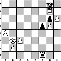 game notation in PGN-format [Event "Mit Sizialisch in den Herbst!"] [Site "www.myChess.de"] [Date "2005.09.22"] [Round "1"] [White "Chelly"] [Black "Knight"] [ECO "B32"] [WhitemyELO "1818"] [BlackmyELO "1361"] [Result "1-0"] [TimeControl "10/1728000"] [WhiteDays "20"] [BlackDays "20"] [MyChessNo "17719"] 1. e4 c5 2. Nf3 Nc6 3. d4 cxd4 4. Nxd4 Nxd4 5. Qxd4 e6 6. Be2 Nf6 7. Nc3 d5 8. exd5 exd5 9. Bg5 Be7 10. O-O-O O-O 11. Bxf6 Bxf6 12. Qxd5 Qxd5 13. Nxd5 Bg5+ 14. f4 Bh6 15. g4 g6 16. g5 Bg7 17. h4 Bf5 18. Ne7+ Kh8 19. h5 Rfe8 20. Nxf5 Rxe2 21. Nxg7 Kxg7 22. h6+ Kg8 23. Rd7 Rc8 24. c3 Rce8 25. Rhd1 Kf8 26. Rxb7 Rf2 27. Rxa7 Rxf4 28. Rdd7 Rf1+ 29. Kc2 Re2+ 30. Kb3 Re8 31. a4 Rb8+ 32. Rdb7 Rxb7+ 33. Rxb7 f5 34. Rxh7 Kg8 35. Rg7+ 1-0 position notation in FEN-format 6k1/6R1/6pP/5pP1/P7/1KP5/1P6/5r2 - - - 2 35 Captured white pieces: Captured black pieces: Click on a captured piece in order to display the desired move!