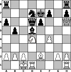 game notation in PGN-format [Event "Sizialianisch"] [Site "www.myChess.de"] [Date "2007.06.22"] [Round "1"] [White "ujack1961"] [Black "Mike"] [ECO "B98"] [WhitemyELO "1801"] [BlackmyELO "1480"] [Result "1-0"] [TimeControl "10/864000"] [WhiteDays "20"] [BlackDays "00"] [MyChessNo "35879"] 1. e4 c5 2. Nf3 d6 3. d4 cxd4 4. Nxd4 Nf6 5. Nc3 a6 6. Bg5 e6 7. f4 Be7 8. Qf3 Qc7 9. Be2 b5 10. e5 Bb7 11. Qg3 Nd5 12. Nxd5 Bxd5 13. Bxe7 Kxe7 14. Qxg7 Nd7 15. Qg5+ Kf8 16. Qh6+ Ke7 17. exd6+ Qxd6 18. O-O-O 1-0 position notation in FEN-format r6r/3nkp1p/p2qp2Q/1p1b4/3N1P2/8/PPP1B1PP/2KR3R - - - 1 18 Captured white pieces: ![]() ![]() ![]() ![]() ![]() ![]() ![]() ![]() ![]() ![]() ![]() ![]() ![]() ![]() ![]() Captured black pieces: ![]() ![]() ![]() ![]() ![]() ![]() ![]() ![]() ![]() ![]() ![]() ![]() ![]() ![]() ![]() Click on a captured piece in order to display the desired move!