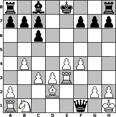 game notation in PGN-format [Event "2.No-Engine-Schachturnier"] [Site "www.myChess.de"] [Date "2013.08.15"] [Round "1"] [White "faustballer"] [Black "paul"] [ECO "C65"] [WhitemyELO "1543"] [BlackmyELO "1323"] [Result "0-1"] [TimeControl "10/1728000"] [WhiteDays "20"] [BlackDays "20"] [MyChessNo "89768"] 1. e4 e5 2. Nf3 Nc6 3. Bb5 Nf6 4. d3 Bc5 5. Bxc6 dxc6 6. Nxe5 Qd4 7. O-O Qxe5 8. Kh1 Ng4 9. f4 Qh5 10. Qxg4 Qxg4 11. Bd2 Qe2 12. Re1 Qf2 13. b4 Bd4 14. c3 Be3 15. Rxe3 Qf1# 0-1 position notation in FEN-format r1b1k2r/ppp2ppp/2p5/8/1P2PP2/2PPR3/P2B2PP/RN3q1K - kq - 1 16 Captured white pieces: Captured black pieces: Click on a captured piece in order to display the desired move!