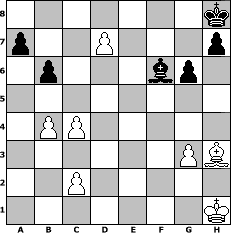 game notation in PGN-format [Event "Schinderhannes-Cup"] [Site "www.myChess.de"] [Date "2011.05.10"] [Round "1"] [Board "2"] [White "haggard"] [Black "martinus"] [ECO "A15"] [WhitemyELO "1936"] [BlackmyELO "1739"] [Result "1/2-1/2"] [TimeControl "10/2592000"] [WhiteDays "120"] [BlackDays "119"] [MyChessNo "73798"] 1. c4 Nf6 2. g3 g6 3. Bg2 Bg7 4. Nc3 d6 5. d3 c6 6. e4 O-O 7. Nge2 e5 8. O-O Be6 9. h3 Nbd7 10. Be3 Qc8 11. f4 exf4 12. Nxf4 Ne5 13. b3 c5 14. Qd2 Bd7 15. d4 cxd4 16. Bxd4 Re8 17. Rad1 Bc6 18. Qf2 b6 19. Bxe5 dxe5 20. Nfd5 Bxd5 21. exd5 e4 22. Rde1 Qd7 23. Nxe4 Nxe4 24. Rxe4 Rxe4 25. Bxe4 Qxh3 26. Qxf7+ Kh8 27. Qf2 Rf8 28. Bg2 Rxf2 29. Bxh3 Rxa2 30. d6 Bd4+ 31. Kh1 Ra1 32. Rxa1 Bxa1 33. d7 Bf6 34. b4 1/2-1/2 position notation in FEN-format 7k/p2P3p/1p3bp1/8/1PP5/6PB/2P5/7K - - - 0 34 Captured white pieces: Captured black pieces: Click on a captured piece in order to display the desired move!
