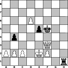 game notation in PGN-format [Event "Bald kommt der Winter"] [Site "www.myChess.de"] [Date "2013.10.31"] [Round "2"] [White "Joschi"] [Black "reisender"] [ECO "B06"] [WhitemyELO "1563"] [BlackmyELO "1431"] [Result "1-0"] [TimeControl "10/2592000"] [WhiteDays "150"] [BlackDays "145"] [MyChessNo "90882"] 1. e4 g6 2. d4 Bg7 3. Nc3 Nf6 4. Nf3 O-O 5. Be2 d6 6. h3 Nc6 7. Be3 e5 8. Qd2 Re8 9. d5 Ne7 10. Bh6 c6 11. Bxg7 Kxg7 12. O-O-O a5 13. g4 b5 14. g5 b4 15. gxf6+ Kxf6 16. Nb1 Kg7 17. h4 c5 18. h5 h6 19. hxg6 Rh8 20. Rdg1 Nxg6 21. Nh4 Qf6 22. Nxg6 fxg6 23. Bh5 g5 24. Qe3 Bd7 25. Nd2 Be8 26. Bxe8 Raxe8 27. Nf3 Rh7 28. Kd1 Rf8 29. Nxg5 hxg5 30. Rxg5+ Kh8 31. Rxh7+ Kxh7 32. Qh3+ Qh6 33. Rh5 Rf6 34. Rxh6+ Rxh6 35. Qd7+ Kg8 36. Qd8+ Kh7 37. Qxa5 Rh1+ 38. Ke2 Kg6 39. Qb6 Kg5 40. Qxd6 Kf4 41. Qxc5 Kxe4 42. d6 Kf4 43. Qe3+ Kf5 44. Qf3+ 1-0 position notation in FEN-format 8/8/3P4/4pk2/1p6/5Q2/PPP1KP2/7r - - - 4 44 Captured white pieces: Captured black pieces: Click on a captured piece in order to display the desired move!
