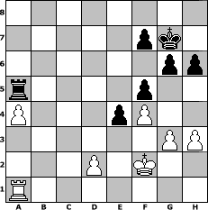 game notation in PGN-format [Event "Spa"] [Site "www.myChess.de"] [Date "2012.01.18"] [Round "1"] [White "Knight"] [Black "lotchi"] [ECO "D00"] [WhitemyELO "1268"] [BlackmyELO "1297"] [Result "1/2-1/2"] [TimeControl "10/2592000"] [WhiteDays "30"] [BlackDays "29"] [MyChessNo "79251"] 1. d4 d5 2. e4 c6 3. Nc3 dxe4 4. Nxe4 Nf6 5. Nxf6+ exf6 6. Nf3 Bb4+ 7. c3 Bd6 8. Bd3 Bg4 9. O-O O-O 10. h3 Bxf3 11. Qxf3 Nd7 12. Qh5 g6 13. Qh6 Qe8 14. Be3 f5 15. d5 cxd5 16. Bd4 Be5 17. Rae1 Rc8 18. Bxa7 Qd8 19. f4 Bg7 20. Qg5 h6 21. Qxd8 Rfxd8 22. Bf2 Nc5 23. Bc2 b6 24. b4 Nd7 25. a4 Bxc3 26. Rd1 Bxb4 27. Bb3 Nc5 28. Bc2 Ne4 29. Bxb6 Rd6 30. Bxe4 dxe4 31. Rxd6 Bxd6 32. g3 Bc5+ 33. Bxc5 Rxc5 34. Ra1 Ra5 35. Kf2 Kg7 1/2-1/2 position notation in FEN-format 8/5pk1/6pp/r4p2/P3pP2/6PP/3P1K2/R7 - - - 4 36 Captured white pieces: Captured black pieces: Click on a captured piece in order to display the desired move!