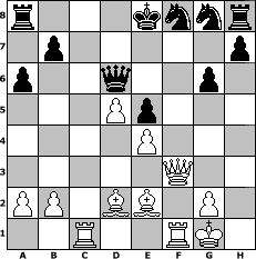game notation in PGN-format [Event "Make myChess great again...."] [Site "www.myChess.de"] [Date "2017.02.11"] [Round "1"] [White "pepo47"] [Black "sprinterde"] [ECO "A04"] [WhitemyELO "2075"] [BlackmyELO "1729"] [Result "1-0"] [TimeControl "10/864000"] [WhiteDays "30"] [BlackDays "29"] [MyChessNo "106869"] 1. Nf3 c5 2. c4 Nc6 3. Nc3 e6 4. e4 g6 5. d4 cxd4 6. Nxd4 e5 7. Ndb5 a6 8. Nd6+ Bxd6 9. Qxd6 Qe7 10. Qd1 d6 11. Nd5 Qd8 12. Be3 Kf8 13. h4 Be6 14. h5 Bxd5 15. cxd5 Nb8 16. Qf3 Ke8 17. hxg6 fxg6 18. Rc1 Nd7 19. Qh3 Nf8 20. f4 Qd7 21. Qf3 Qa4 22. fxe5 dxe5 23. Be2 Qb4+ 24. Bd2 Qd6 25. O-O 1-0 position notation in FEN-format r3knnr/1p5p/p2q2p1/3Pp3/4P3/5Q2/PP1BB1P1/2R2RK1 - - - 5 25 Captured white pieces: Captured black pieces: Click on a captured piece in order to display the desired move!
