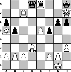 game notation in PGN-format [Event "Die Weinlese 2o2o"] [Site "www.myChess.de"] [Date "2020.08.30"] [Round "1"] [White "skuehnel"] [Black "lotchi"] [ECO "A00"] [WhitemyELO "1252"] [BlackmyELO "1169"] [Result "1-0"] [TimeControl "10/2592000"] [WhiteDays "68"] [BlackDays "89"] [MyChessNo "119221"] 1. c3 e5 2. d4 exd4 3. cxd4 Nf6 4. e3 d5 5. Nf3 Nc6 6. Nc3 Be6 7. Be2 Bd6 8. O-O h6 9. Bd2 O-O 10. h3 Ne4 11. Bd3 Nxc3 12. Bxc3 f5 13. Rc1 a6 14. Qb3 b5 15. Ne5 Bxe5 16. dxe5 g6 17. Bd2 Na5 18. Bxa5 Qd7 19. Rxc7 Qe8 20. Rc1 Qb8 21. R1c6 Re8 22. e4 Ra7 23. exd5 Bxd5 24. Qxd5+ Kh8 25. Qf7 Rxc7 26. Rxc7 Qd8 27. Qh7# 1-0 position notation in FEN-format 3qr2k/2R4Q/p5pp/Bp2Pp2/8/3B3P/PPP2PP1/6K1 - - - 2 27 Captured white pieces: Captured black pieces: Click on a captured piece in order to display the desired move!