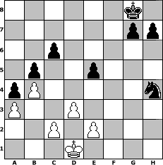 game notation in PGN-format [Event "II. Intergalaktische Meisterschaft"] [Site "www.myChess.de"] [Date "2008.09.08"] [Round "2"] [White "Haneken"] [Black "werderfan"] [ECO "C20"] [WhitemyELO "1506"] [BlackmyELO "1573"] [Result "0-1"] [TimeControl "10/2592000"] [WhiteDays "30"] [BlackDays "30"] [MyChessNo "47862"] 1. e4 e5 2. Nh3 Bc5 3. Bb5 a6 4. Bc4 d5 5. Bxd5 Bxh3 6. gxh3 Qh4 7. Qf3 Nf6 8. Qg3 Qxg3 9. fxg3 c6 10. Bc4 Nxe4 11. g4 O-O 12. d3 Nf2 13. Rf1 Nxh3 14. Nc3 Nd7 15. Ne4 Be7 16. Be3 b5 17. Bb3 a5 18. O-O-O a4 19. Bxf7+ Rxf7 20. a3 Raf8 21. Rxf7 Rxf7 22. Kb1 Nf6 23. Nxf6+ Rxf6 24. Kc1 Rg6 25. Rf1 Rxg4 26. Rf5 Bg5 27. Bxg5 Rxg5 28. Rf1 Rg1 29. Rxg1 Nxg1 30. b4 Nf3 31. h3 Ng5 32. h4 Nf3 33. Kd1 Nxh4 0-1 position notation in FEN-format 6k1/6pp/2p5/1p2p3/pP5n/P2P4/2P1P3/3K4 - - - 0 34 Captured white pieces: Captured black pieces: Click on a captured piece in order to display the desired move!