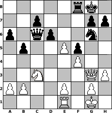 game notation in PGN-format [Event "FSO1-1-45"] [Site "www.myChess.de"] [Date "2005.05.26"] [Round "2"] [White "Wormatia08"] [Black "Dragonwolves"] [ECO "C91"] [WhitemyELO "1350"] [BlackmyELO "2010"] [Result "0-1"] [TimeControl "10/2592000"] [WhiteDays "00"] [BlackDays "30"] [MyChessNo "13594"] 1. e4 e5 2. Nf3 Nc6 3. Bb5 a6 4. Ba4 Nf6 5. O-O Be7 6. Re1 b5 7. Bb3 d6 8. c3 O-O 9. d4 Bg4 10. h3 Bxf3 11. Qxf3 exd4 12. Bg5 Nd7 13. Bxe7 Qxe7 14. Bd5 Nde5 15. Qg3 Qe8 16. cxd4 Nxd4 17. Bxa8 Qxa8 18. Nc3 Nc2 19. Rad1 Nxe1 20. Rxe1 f5 21. f4 Ng6 22. e5 Qc6 0-1 position notation in FEN-format 5rk1/2p3pp/p1qp2n1/1p2Pp2/5P2/2N3QP/PP2P1P1/4R1K1 - - - 1 23 Captured white pieces: Captured black pieces: Click on a captured piece in order to display the desired move!
