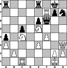 game notation in PGN-format [Event "d4 f"] [Site "www.myChess.de"] [Date "2005.05.31"] [Round "2"] [White "myfairlady"] [Black "Knight"] [ECO "E11"] [WhitemyELO "1809"] [BlackmyELO "1230"] [Result "1-0"] [TimeControl "10/1728000"] [WhiteDays "56"] [BlackDays "60"] [MyChessNo "13754"] 1. d4 Nf6 2. c4 e6 3. Nf3 Bb4+ 4. Bd2 Bxd2+ 5. Nbxd2 d5 6. e3 Nc6 7. Bd3 O-O 8. O-O Re8 9. Ne5 b6 10. Nxc6 Qd6 11. Ne5 dxc4 12. Ndxc4 Qe7 13. Qf3 Ba6 14. Rac1 Nd5 15. a3 c5 16. dxc5 bxc5 17. Rfd1 Nf6 18. Qh3 Bb7 19. Bxh7+ Nxh7 20. Rd7 Qf6 21. Rxb7 a5 22. f4 a4 23. Rxf7 1-0 position notation in FEN-format r3r1k1/5Rpn/4pq2/2p1N3/p1N2P2/P3P2Q/1P4PP/2R3K1 - - - 0 23 Captured white pieces: Captured black pieces: Click on a captured piece in order to display the desired move!