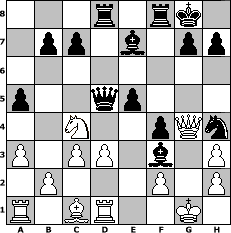 game notation in PGN-format [Event "Wrixum - Open die I."] [Site "www.myChess.de"] [Date "2004.12.11"] [Round "1"] [White "Seneca"] [Black "bjeu"] [ECO "C47"] [WhitemyELO "1634"] [BlackmyELO "1510"] [Result "0-1"] [TimeControl "10/2592000"] [WhiteDays "30"] [BlackDays "30"] [MyChessNo "8725"] 1. e4 e5 2. Nf3 Nc6 3. Nc3 Nf6 4. Be2 d5 5. exd5 Nxd5 6. Ne4 Be7 7. O-O Bf5 8. Ng3 Bg6 9. d3 O-O 10. a3 a5 11. Nd2 Nd4 12. Bg4 f5 13. Bh3 Nf4 14. Nc4 Nxh3+ 15. gxh3 f4 16. Ne4 Qd5 17. c3 Nf5 18. Qf3 Rad8 19. Rd1 Nh4 20. Qe2 Bxe4 21. Qg4 Bf3 0-1 position notation in FEN-format 3r1rk1/1pp1b1pp/8/p2qp3/2N2pQn/P1PP1b1P/1P3P1P/R1BR2K1 - - - 2 22 Captured white pieces: Captured black pieces: Click on a captured piece in order to display the desired move!