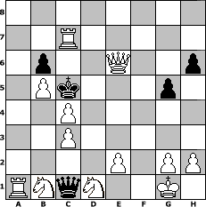 game notation in PGN-format [Event "Unter 1501"] [Site "www.myChess.de"] [Date "2020.08.24"] [Round "2"] [White "wolni55"] [Black "Haneken"] [ECO "C41"] [WhitemyELO "1416"] [BlackmyELO "1142"] [Result "1-0"] [TimeControl "10/2592000"] [WhiteDays "106"] [BlackDays "118"] [MyChessNo "119189"] 1. e4 e5 2. Nf3 d6 3. Bc4 Be7 4. d3 Nf6 5. Ng5 d5 6. exd5 Nxd5 7. Ne4 Bb4+ 8. c3 Ba5 9. a4 Qd7 10. b4 Bb6 11. a5 Bxf2+ 12. Nxf2 O-O 13. Qh5 h6 14. O-O Qd6 15. Ba3 Ne3 16. b5 c5 17. Re1 Nxc4 18. dxc4 Qd8 19. Rxe5 Qxa5 20. Rxc5 Qd8 21. Rd5 Qf6 22. Bxf8 Kxf8 23. Qd1 Qg6 24. Rd8+ Ke7 25. Rxc8 b6 26. Qd8+ Ke6 27. Rxb8 Qc2 28. Qd5+ Ke7 29. Rxa8 Qc1+ 30. Nd1 g5 31. R8xa7+ Kf6 32. Qxf7+ Ke5 33. Re7+ Kd6 34. Qe6+ Kc5 35. Rc7# 1-0 position notation in FEN-format 8/2R5/1p2Q2p/1Pk3p1/2P5/2P5/4P1PP/RNqN2K1 - - - 6 35 Captured white pieces: Captured black pieces: Click on a captured piece in order to display the desired move!