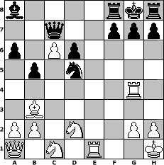 game notation in PGN-format [Event "Winterende"] [Site "www.myChess.de"] [Date "2024.03.15"] [Round "1"] [White "Grubengeist"] [Black "deepsabel"] [Variant "Fischerrandom"] [SetUp "1"] [FEN "bqnbnrkr/pppppppp/8/8/8/8/PPPPPPPP/BQNBNRKR w KQkq - 0 1"] [WhitemyELO "2118"] [BlackmyELO "1765"] [Result "1-0"] [TimeControl "10/3456000"] [WhiteDays "80"] [BlackDays "80"] [MyChessNo "131694"] 1. b4 Nf6 2. c4 b6 3. Nf3 e6 4. Re1 Be7 5. e4 c5 6. bxc5 Bxc5 7. d4 Be7 8. O-O d6 9. d5 e5 10. c5 b5 11. c6 a6 12. Nd2 Nb6 13. Kh1 Qc7 14. f4 exf4 15. Rxf4 Nfxd5 16. exd5 Nxd5 17. Rg4 Bf6 18. Bb3 Bxa1 19. Qxa1 1-0 position notation in FEN-format b4rkr/2q2ppp/p1Pp4/1p1n4/6R1/1B6/PP1N2PP/Q1N1R2K - kq - 0 19 Captured white pieces: Captured black pieces: Click on a captured piece in order to display the desired move!