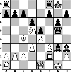 game notation in PGN-format [Event "mal so"] [Site "www.myChess.de"] [Date "2013.12.02"] [Round "1"] [White "Mattheus"] [Black "Steffi"] [ECO "C20"] [WhitemyELO "1476"] [BlackmyELO "1616"] [Result "0-1"] [TimeControl "10/1728000"] [WhiteDays "17"] [BlackDays "17"] [MyChessNo "91446"] 1. e4 e5 2. Qh5 Nc6 3. Bc4 g6 4. Qf3 Nf6 5. Nc3 Bg7 6. d3 d6 7. Bg5 Nd4 8. Qd1 O-O 9. Nge2 Bg4 10. O-O Qd7 11. Bxf6 Bxf6 12. f3 Nxf3+ 13. gxf3 Bh3 14. Rf2 Bh4 15. Ng3 Qe7 16. Nd5 Qg5 17. Qe1 Bxg3 0-1 position notation in FEN-format r4rk1/ppp2p1p/3p2p1/3Np1q1/2B1P3/3P1Pbb/PPP2R1P/R3Q1K1 - - - 0 18 Captured white pieces: ![]() ![]() ![]() ![]() ![]() ![]() ![]() ![]() ![]() ![]() ![]() ![]() ![]() ![]() ![]() Captured black pieces: ![]() ![]() ![]() ![]() ![]() ![]() ![]() ![]() ![]() ![]() ![]() ![]() ![]() ![]() ![]() Click on a captured piece in order to display the desired move!