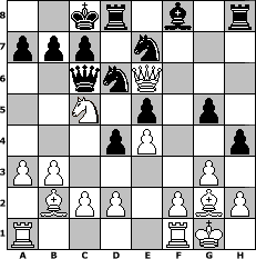 game notation in PGN-format [Event "Auf Die WM!!!!!!!!!!!! (2010 werden wir Meister)"] [Site "www.myChess.de"] [Date "2006.07.21"] [Round "2"] [White "JerryWho"] [Black "Vouivre"] [ECO "A40"] [WhitemyELO "1587"] [BlackmyELO "1549"] [Result "1/2-1/2"] [TimeControl "10/2592000"] [WhiteDays "77"] [BlackDays "13"] [MyChessNo "27079"] 1. d4 e5 2. dxe5 d6 3. Nf3 Nc6 4. Bf4 d5 5. Nc3 Nge7 6. g3 Be6 7. Bg2 Qd7 8. O-O O-O-O 9. Nd4 h6 10. a3 g5 11. Nxe6 fxe6 12. Bc1 Nxe5 13. b3 Nf7 14. e4 d4 15. Na4 h5 16. Bb2 e5 17. Qd3 h4 18. Nc5 Qc6 19. Qc4 Nd6 20. Qe6+ 1/2-1/2 position notation in FEN-format 2kr1b1r/ppp1n3/2qnQ3/2N1p1p1/3pP2p/PP4P1/1BPP1PBP/R4RK1 - - - 5 20 Captured white pieces: Captured black pieces: Click on a captured piece in order to display the desired move!