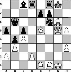 game notation in PGN-format [Event "Schon wieder."] [Site "www.myChess.de"] [Date "2017.10.12"] [Round "1"] [White "Helmut48"] [Black "alibengali"] [ECO "D00"] [WhitemyELO "1960"] [BlackmyELO "1661"] [Result "1-0"] [TimeControl "10/2592000"] [WhiteDays "118"] [BlackDays "104"] [MyChessNo "109908"] 1. d4 d5 2. e4 dxe4 3. Nc3 Nf6 4. f3 exf3 5. Qxf3 c6 6. Qf2 g6 7. h3 Bg7 8. Bd3 O-O 9. Nf3 Nbd7 10. O-O Qc7 11. Bg5 b5 12. Rae1 Re8 13. Bh4 b4 14. Ne4 Nxe4 15. Rxe4 Nf6 16. Ne5 Bf5 17. Ree1 Be6 18. Bg3 Qb7 19. c4 Rad8 20. Nf3 a5 21. Ng5 Bc8 22. Be5 c5 23. d5 Rf8 24. b3 Qb6 25. g4 h6 26. Nf3 h5 27. Qh4 Nxd5 28. gxh5 Bf6 29. Ng5 Bxg5 30. Qxg5 Nf6 31. Bxg6 1-0 position notation in FEN-format 2br1rk1/4pp2/1q3nB1/p1p1B1QP/1pP5/1P5P/P2P4/4RRK1 - - - 0 31 Captured white pieces: Captured black pieces: Click on a captured piece in order to display the desired move!