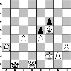 game notation in PGN-format [Event "Only for friends"] [Site "www.myChess.de"] [Date "2005.02.24"] [Round "1"] [White "Seneca"] [Black "rikilatic"] [ECO "C40"] [WhitemyELO "1523"] [BlackmyELO "1502"] [Result "1-0"] [TimeControl "10/1728000"] [WhiteDays "20"] [BlackDays "20"] [MyChessNo "10645"] 1. e4 e5 2. Nf3 Qf6 3. d3 h6 4. Nc3 Bb4 5. Be2 Nc6 6. Bd2 Bxc3 7. bxc3 Nge7 8. O-O d6 9. h3 Qg6 10. Kh1 h5 11. Nh2 f5 12. exf5 Bxf5 13. Nf3 Nd8 14. c4 Nf7 15. Nh4 Qe6 16. Nxf5 Nxf5 17. Bxh5 O-O-O 18. Bg4 Kb8 19. c3 N7h6 20. Bxh6 Qxh6 21. Bxf5 Rdf8 22. Bg4 Rf4 23. Qe2 Qg5 24. f3 Rf6 25. Rab1 Qf4 26. Qe4 Qxe4 27. fxe4 Rg6 28. Kg1 b6 29. Rf7 Kb7 30. Rbf1 a5 31. a4 Kc6 32. Re7 Rf6 33. Rxf6 gxf6 34. Kf2 Rf8 35. Bd7+ Kc5 36. Be6 d5 37. cxd5 b5 38. Rxc7+ Kb6 39. Rc6+ Kb7 40. axb5 a4 41. d6 a3 42. d7 Rd8 43. Ra6 Kc7 44. Rxa3 Kd6 45. Bf5 Kc5 46. c4 Kd4 47. b6 Rb8 48. b7 Kc5 49. Ra8 Rxa8 50. bxa8=Q Kd4 51. Qa1+ Kxd3 52. d8=Q+ Kc2 53. Qa3 Kb1 54. Qd1# 1-0 position notation in FEN-format 8/8/5p2/4pB2/2P1P3/R6P/5KP1/1k1Q4 - - - 4 54 Captured white pieces: Captured black pieces: Click on a captured piece in order to display the desired move!