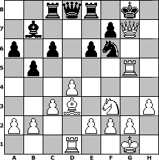 game notation in PGN-format [Event "Entdeckung der Langsamkeit III"] [Site "www.myChess.de"] [Date "2013.03.15"] [Round "1"] [White "leitsgeheier"] [Black "Joschi"] [ECO "B17"] [WhitemyELO "1610"] [BlackmyELO "1600"] [Result "1-0"] [TimeControl "10/3456000"] [WhiteDays "077"] [BlackDays "120"] [MyChessNo "87069"] 1. e4 c6 2. d4 d5 3. Nc3 dxe4 4. Nxe4 Nd7 5. Ng5 Ngf6 6. Bd3 e6 7. N1f3 h6 8. Ne4 Nxe4 9. Bxe4 Nf6 10. Bd3 Bd6 11. O-O O-O 12. c3 b5 13. h3 Bb7 14. Be3 a6 15. Qd2 Rc8 16. Rfe1 Nd5 17. Bxh6 gxh6 18. Qxh6 Nf6 19. Rad1 Re8 20. Re5 Bf8 21. Rg5+ Bg7 22. Qxg7# 1-0 position notation in FEN-format 2rqr1k1/1b3pQ1/p1p1pn2/1p4R1/3P4/2PB1N1P/PP2PPP1/3R2K1 - - - 0 22 Captured white pieces: Captured black pieces: Click on a captured piece in order to display the desired move!