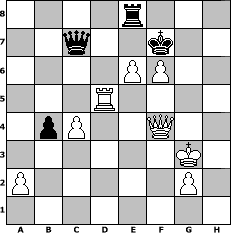 game notation in PGN-format [Event "R"] [Site "www.myChess.de"] [Date "2009.01.29"] [Round "1"] [White "reisinger"] [Black "beowulf"] [ECO "A34"] [WhitemyELO "1422"] [BlackmyELO "1449"] [Result "1-0"] [TimeControl "10/864000"] [WhiteDays "58"] [BlackDays "60"] [MyChessNo "52148"] 1. c4 c5 2. Nc3 Nf6 3. e3 e6 4. d4 d5 5. Nf3 Nc6 6. cxd5 Nxd5 7. Bb5 Bd7 8. O-O a6 9. Nxd5 axb5 10. Nc3 b4 11. Ne4 b6 12. dxc5 bxc5 13. Qc2 Qb6 14. Rd1 Rd8 15. Qb3 Be7 16. Nd6+ Bxd6 17. Rxd6 Qc7 18. Qd3 O-O 19. b3 Bc8 20. Ng5 g6 21. Rxd8 Rxd8 22. Qe2 Ne5 23. Bb2 f6 24. Ne4 Kg7 25. h3 Rd7 26. Qc2 c4 27. f4 c3 28. fxe5 cxb2 29. exf6+ Kf7 30. Qxb2 h6 31. Nd2 Bb7 32. Nc4 Qg3 33. Rf1 Rd5 34. e4 Rg5 35. Qd2 Qc7 36. Rc1 Rc5 37. Qd4 Kf8 38. Rf1 e5 39. Qe3 g5 40. h4 Ba6 41. hxg5 hxg5 42. Qxg5 Bxc4 43. bxc4 Qf7 44. Rd1 Rc8 45. Qxe5 Re8 46. Qg5 Rc8 47. e5 Qa7+ 48. Kh2 Qh7+ 49. Kg3 Qc7 50. Qh6+ Kg8 51. Qg6+ Kf8 52. Rd5 Re8 53. Qh6+ Kg8 54. Qf4 Kf7 55. e6+ 1-0 position notation in FEN-format 4r3/2q2k2/4PP2/3R4/1pP2Q2/6K1/P5P1/8 - - - 0 55 Captured white pieces: Captured black pieces: Click on a captured piece in order to display the desired move!