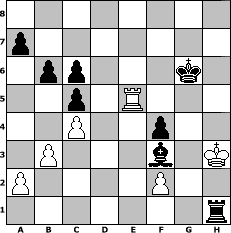 game notation in PGN-format [Event "Sebastian Kneip 960er-Turnier 2014"] [Site "www.myChess.de"] [Date "2014.05.17"] [Round "1"] [White "Achimkogge"] [Black "SibylleSchwerdt"] [Variant "Fischerrandom"] [SetUp "1"] [FEN "bnqbnrkr/pppppppp/8/8/8/8/PPPPPPPP/BNQBNRKR w KQkq - 0 1"] [WhitemyELO "1425"] [BlackmyELO "1701"] [Result "0-1"] [TimeControl "10/3456000"] [WhiteDays "40"] [BlackDays "35"] [MyChessNo "94459"] 1. c4 c5 2. b3 b6 3. e4 Bxe4 4. d3 Bg6 5. Bf3 Nc6 6. Bc3 Nf6 7. Bxf6 exf6 8. Bxc6 dxc6 9. Qe3 Bc7 10. h3 Re8 11. Qf3 O-O 12. Nc2 Qe6 13. Rd1 Qe2 14. Qxe2 Rxe2 15. Rd2 Rxd2 16. Nxd2 Bxd3 17. Ne3 Rd8 18. g3 Be5 19. Kh2 Bg6 20. Nf3 Be4 21. Kg2 g6 22. h4 h5 23. g4 hxg4 24. Nxg4 Rd3 25. Ngxe5 fxe5 26. Rh3 f5 27. Rg3 Kf7 28. Rh3 f4 29. h5 gxh5 30. Rxh5 Bxf3+ 31. Kh3 Rd1 32. Rf5+ Kg6 33. Rxe5 Rh1# 0-1 position notation in FEN-format 8/p7/1pp3k1/2p1R3/2P2p2/1P3b1K/P4P2/7r - - - 1 34 Captured white pieces: Captured black pieces: Click on a captured piece in order to display the desired move!