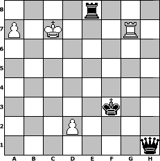 game notation in PGN-format [Event "Mal wieder spielen 2"] [Site "www.myChess.de"] [Date "2013.05.12"] [Round "1"] [White "reisinger"] [Black "Ziegert"] [ECO "D20"] [WhitemyELO "1494"] [BlackmyELO "1571"] [Result "0-1"] [TimeControl "10/1728000"] [WhiteDays "120"] [BlackDays "027"] [MyChessNo "88284"] 1. d4 d5 2. c4 dxc4 3. Nc3 e5 4. d5 a6 5. a3 b5 6. b4 cxb3 7. Qxb3 Nf6 8. Bb2 Bc5 9. Nf3 Ng4 10. e3 Bb7 11. h3 Nf6 12. Nxe5 O-O 13. e4 Re8 14. f4 c6 15. Nxf7 Qe7 16. Ne5 cxd5 17. exd5 Nbd7 18. d6+ Qe6 19. Qxe6+ Rxe6 20. O-O-O Bxd6 21. Nxd7 Nxd7 22. Bd3 Bxf4+ 23. Kb1 Nc5 24. Rhf1 Nxd3 25. Rxd3 Rf8 26. Rd4 Bg3 27. Rxf8+ Kxf8 28. Rd8+ Kf7 29. Nd5 Bxd5 30. Rxd5 Kg6 31. Rd7 Be5 32. Bxe5 Rxe5 33. Rd6+ Kf5 34. Rxa6 Re1+ 35. Kb2 Re2+ 36. Kc3 Rxg2 37. Kb4 Rg3 38. Kxb5 Rxh3 39. a4 g5 40. Rc6 g4 41. Rc1 Rb3+ 42. Ka6 g3 43. a5 g2 44. Ka7 Kf4 45. a6 Kf3 46. Ka8 h5 47. a7 h4 48. Rg1 h3 49. Rxg2 Re3 50. Rg7 h2 51. Kb8 Re8+ 52. Kc7 h1=Q 0-1 position notation in FEN-format 4r3/P1K3R1/8/8/8/5k2/3P4/7q - - - 0 53 Captured white pieces: Captured black pieces: Click on a captured piece in order to display the desired move!