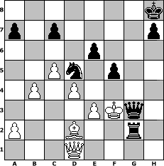 game notation in PGN-format [Event "2.No-Engine-Schachturnier"] [Site "www.myChess.de"] [Date "2013.08.15"] [Round "1"] [White "Master1"] [Black "rux"] [ECO "D00"] [WhitemyELO "1270"] [BlackmyELO "1487"] [Result "0-1"] [TimeControl "10/1728000"] [WhiteDays "15"] [BlackDays "18"] [MyChessNo "89774"] 1. d4 d5 2. e3 Nf6 3. Nf3 Bg4 4. Nbd2 Ne4 5. Be2 e6 6. O-O Bd6 7. c3 O-O 8. Nxe4 dxe4 9. Nd2 Bxe2 10. Qxe2 f5 11. f4 Rf6 12. Nc4 Rh6 13. Nxd6 Qxd6 14. Qb5 Nd7 15. Qxb7 Nb6 16. Qa6 g5 17. Qe2 Nd5 18. Bd2 Kh8 19. c4 gxf4 20. c5 f3 21. Rxf3 Qxh2+ 22. Kf2 exf3 23. Qxf3 Rg8 24. Rg1 Rhg6 25. b4 Rg3 26. Qd1 Rxg2+ 27. Rxg2 Rxg2+ 28. Kf3 Qg3# 0-1 position notation in FEN-format 7k/p1p4p/4p3/2Pn1p2/1P1P4/4PKq1/P2B2r1/3Q4 - - - 2 29 Captured white pieces: Captured black pieces: Click on a captured piece in order to display the desired move!