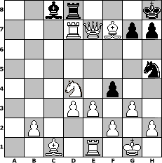 game notation in PGN-format [Event "Sp"] [Site "www.myChess.de"] [Date "2011.09.01"] [Round "1"] [White "Haki"] [Black "reisender"] [ECO "A00"] [WhitemyELO "1297"] [BlackmyELO "1388"] [Result "1-0"] [TimeControl "10/2592000"] [WhiteDays "90"] [BlackDays "90"] [MyChessNo "76046"] 1. g3 d5 2. Bg2 Nf6 3. Nf3 Nc6 4. O-O e5 5. d3 Be7 6. Nbd2 O-O 7. Re1 Bc5 8. c3 d4 9. cxd4 exd4 10. a3 b5 11. Qc2 Qe7 12. Ng5 b4 13. Bxc6 Rb8 14. axb4 Bxb4 15. Rxa7 Nh5 16. Ngf3 Qe6 17. Nxd4 Qg4 18. e3 Bd6 19. Ne4 f5 20. Nxd6 cxd6 21. Bd5+ Kh8 22. Qc7 Rb4 23. Qxd6 Re8 24. Qxb4 f4 25. Bf7 Rd8 26. Qe7 Qd7 27. Rxd7 1-0 position notation in FEN-format 2br3k/3RQBpp/8/7n/3N1p2/3PP1P1/1P3P1P/2B1R1K1 - - - 0 27 Captured white pieces: Captured black pieces: Click on a captured piece in order to display the desired move!