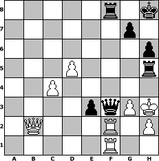 game notation in PGN-format [Event "April 2018"] [Site "www.myChess.de"] [Date "2018.04.11"] [Round "1"] [White "Joschi"] [Black "alibengali"] [ECO "C40"] [WhitemyELO "1528"] [BlackmyELO "1720"] [Result "0-1"] [TimeControl "10/1728000"] [WhiteDays "100"] [BlackDays "099"] [MyChessNo "111926"] 1. e4 e5 2. Nf3 d5 3. Nxe5 Bd6 4. d4 dxe4 5. Nc3 Nf6 6. Bg5 h6 7. Bxf6 Qxf6 8. Nc4 Bb4 9. Qd2 O-O 10. a3 Bxc3 11. bxc3 Nc6 12. Be2 Be6 13. O-O b5 14. Ne3 a6 15. Rad1 Rad8 16. Qc1 Bd5 17. Nxd5 Rxd5 18. a4 Ne7 19. axb5 axb5 20. Qb2 c6 21. c4 bxc4 22. Bxc4 Rd7 23. c3 Nd5 24. Rde1 Qg6 25. Bxd5 cxd5 26. f3 Qc6 27. fxe4 dxe4 28. Re3 f5 29. Qb3+ Kh8 30. Qb4 Rdf7 31. c4 f4 32. d5 Qg6 33. Rc3 f3 34. g3 Qg5 35. Qb2 e3 36. Rcc1 f2+ 37. Kg2 Qg4 38. Rc2 Qf3+ 39. Kh3 Rf5 40. Rcxf2 Rh5# 0-1 position notation in FEN-format 5r1k/6p1/7p/3P3r/2P5/4pqPK/1Q3R1P/5R2 - - - 1 41 Captured white pieces: ![]() ![]() ![]() ![]() ![]() ![]() ![]() ![]() ![]() ![]() ![]() ![]() ![]() ![]() ![]() Captured black pieces: ![]() ![]() ![]() ![]() ![]() ![]() ![]() ![]() ![]() ![]() ![]() ![]() ![]() ![]() ![]() Click on a captured piece in order to display the desired move!