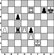 game notation in PGN-format [Event "2011 geht es rund!"] [Site "www.myChess.de"] [Date "2010.12.20"] [Round "1"] [White "Duschgel"] [Black "werderfan"] [ECO "A22"] [WhitemyELO "1579"] [BlackmyELO "1493"] [Result "1/2-1/2"] [TimeControl "10/864000"] [WhiteDays "48"] [BlackDays "42"] [MyChessNo "70665"] 1. c4 e5 2. Nc3 Nf6 3. g3 d5 4. cxd5 Nxd5 5. Bg2 c6 6. Nf3 Nxc3 7. bxc3 Bd6 8. a4 O-O 9. Ba3 Bxa3 10. Rxa3 Re8 11. O-O h6 12. d3 Bg4 13. h3 Bh5 14. Rb3 Qc7 15. Nd2 Nd7 16. g4 Bg6 17. Qb1 Nc5 18. Ra3 Rad8 19. Qb4 Na6 20. Qc4 Qd6 21. Ra2 h5 22. Rb1 Rd7 23. Bf3 hxg4 24. Bxg4 Rde7 25. Bf3 Nc5 26. Be4 Bxe4 27. Nxe4 Nxe4 28. Qxe4 Qh6 29. Kh2 f5 30. Qc4+ Kh8 31. Rab2 e4 32. Rxb7 Qf4+ 33. Kg1 Re6 34. e3 Rg6+ 35. Kf1 Qf3 36. d4 Qxh3+ 37. Ke1 Rg1+ 38. Kd2 Rg2 39. Qe2 Qh4 40. Rf1 f4 41. exf4 Qxf4+ 42. Qe3 Qf3 43. Ke1 Rf8 44. Re7 Qxe3+ 45. fxe3 Rxf1+ 46. Kxf1 Rc2 47. Rxa7 Rxc3 48. Kf2 Kh7 49. Re7 Rc4 1/2-1/2 position notation in FEN-format 8/4R1pk/2p5/8/P1rPp3/4P3/5K2/8 - - - 4 50 Captured white pieces: Captured black pieces: Click on a captured piece in order to display the desired move!