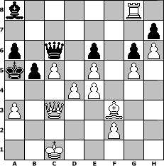 game notation in PGN-format [Event "Albspiele 10"] [Site "www.myChess.de"] [Date "2011.02.16"] [Round "1"] [White "lotchi"] [Black "Winston"] [ECO "A00"] [WhitemyELO "1411"] [BlackmyELO "1454"] [Result "1-0"] [TimeControl "10/1728000"] [WhiteDays "99"] [BlackDays "99"] [MyChessNo "72067"] 1. b4 Nh6 2. Nc3 e6 3. a3 Qf6 4. Nf3 a6 5. Bb2 b5 6. e3 Bb7 7. d4 Bd6 8. Be2 c6 9. Qd3 Bc7 10. O-O-O Ng4 11. Rdf1 Qh6 12. h3 Nf6 13. Rfg1 d5 14. g4 Nbd7 15. g5 Qg6 16. h4 Ne4 17. Rf1 f6 18. h5 Qf7 19. Nxe4 dxe4 20. Qxe4 f5 21. Qd3 O-O-O 22. Qb3 Nb6 23. h6 g6 24. Rhg1 Nd5 25. Ne5 Bxe5 26. dxe5 Rd7 27. Rd1 Rhd8 28. Bd4 f4 29. e4 f3 30. Bxf3 Nf4 31. Qe3 Ba8 32. Rg4 Rxd4 33. Rxd4 Rxd4 34. Rxf4 Qd7 35. Rf8+ Kb7 36. Rg8 Kb6 37. c3 c5 38. bxc5+ Ka5 39. cxd4 Qc6 40. Qc3+ 1-0 position notation in FEN-format b5R1/7p/p1q1p1pP/kpP1P1P1/3PP3/P1Q2B2/5P2/2K5 - - - 2 40 Captured white pieces: Captured black pieces: Click on a captured piece in order to display the desired move!