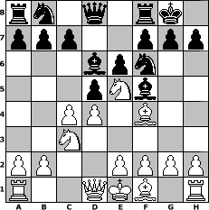 game notation in PGN-format [Event "Windecker Herbst-Open"] [Site "www.myChess.de"] [Date "2014.10.08"] [Round "1"] [White "Tomino"] [Black "Naunhofer"] [ECO "A46"] [WhitemyELO "1603"] [BlackmyELO "1594"] [Result "0-1"] [TimeControl "10/1728000"] [WhiteDays "00"] [BlackDays "15"] [MyChessNo "96203"] 1. d4 Nf6 2. Nf3 d5 3. Bf4 Bf5 4. c4 e6 5. Nc3 Bd6 6. Ne5 Nh5 7. Bd2 Nf6 8. Bf4 O-O 0-1 position notation in FEN-format rn1q1rk1/ppp2ppp/3bpn2/3pNb2/2PP1B2/2N5/PP2PPPP/R2QKB1R - KQ - 8 9 Captured white pieces: Captured black pieces: Click on a captured piece in order to display the desired move!