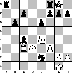 game notation in PGN-format [Event "Zwischendurch mal ein paar eigene Z"] [Site "www.myChess.de"] [Date "2009.06.25"] [Round "1"] [White "bluescreenlover"] [Black "Rotstift10"] [ECO "E20"] [WhitemyELO "1379"] [BlackmyELO "1486"] [Result "0-1"] [TimeControl "10/1728000"] [WhiteDays "27"] [BlackDays "32"] [MyChessNo "56924"] 1. d4 Nf6 2. c4 e6 3. Nc3 Be7 4. e4 d5 5. Qf3 dxe4 6. Nxe4 Qxd4 7. Be3 Qxb2 8. Rd1 Bb4+ 9. Bd2 Bxd2+ 10. Nxd2 Qxa2 11. Bd3 Qa5 12. Ne2 Nc6 13. O-O O-O 14. Qh3 Qh5 15. Nf4 Qxh3 16. Nxh3 Nb4 17. Be4 Nxe4 18. Nxe4 a5 19. f3 a4 20. Rd4 b6 21. Rfd1 Bb7 22. Nhf2 a3 23. Ra1 Nc2 24. Ra2 Nxd4 25. Nd3 Ba6 26. Rxa3 Bxc4 27. Rc3 Ne2+ 0-1 position notation in FEN-format r4rk1/2p2ppp/1p2p3/8/2b1N3/2RN1P2/4n1PP/6K1 - - - 2 28 Captured white pieces: Captured black pieces: Click on a captured piece in order to display the desired move!