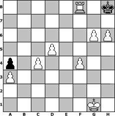 | game notation in PGN-format [Event "Zug um Zug gegen Fr"] [Site "www.myChess.de"] [Date "2010.05.04"] [Round "1"] [White "Caligula"] [Black "Ostseeboy"] [ECO "A80"] [WhitemyELO "1360"] [BlackmyELO "1209"] [Result "1-0"] [TimeControl "10/2592000"] [WhiteDays "180"] [BlackDays "166"] [MyChessNo "65315"] 1. d4 f5 2. Nc3 Nf6 3. f3 e6 4. e4 Be7 5. e5 Nd5 6. Nxd5 exd5 7. Ne2 O-O 8. Nc3 Nc6 9. Nxd5 b6 10. Nxe7+ Qxe7 11. c3 Bb7 12. Bc4+ Kh8 13. O-O a6 14. Re1 b5 15. Bd3 Qe6 16. Qc2 Rae8 17. Bf4 Kg8 18. b3 Re7 19. a3 Kh8 20. Bd2 Nd8 21. c4 bxc4 22. Bxc4 Qb6 23. Qd3 d5 24. exd6 Rxe1+ 25. Rxe1 cxd6 26. Qe3 Nc6 27. Bc3 Qd8 28. f4 h6 29. d5 Nb8 30. Qa7 Qc8 31. Re7 Nd7 32. Bxg7+ Kg8 33. Bxf8 Kxf8 34. Qe3 Qc5 35. Qxc5 Nxc5 36. Rh7 Kg8 37. Rxh6 Ne4 38. Rh3 Nd2 39. Rh6 Nxc4 40. bxc4 Kg7 41. Rxd6 Kf8 42. Rf6+ Ke7 43. Rxf5 Ke8 44. g4 Ke7 45. g5 Ke8 46. h4 Ke7 47. g6 a5 48. Rf7+ Ke8 49. Rxb7 Kf8 50. Rf7+ Kg8 51. h5 Kh8 52. h6 a4 53. Rf8# 1-0 position notation in FEN-format 5R1k/8/6PP/3P4/p1P2P2/P7/8/6K1 - - - 1 53 Captured white pieces:                              Captured black pieces:                               Click on a captured piece in order to display the desired move!