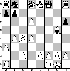 game notation in PGN-format [Event "2016"] [Site "www.myChess.de"] [Date "2016.01.01"] [Round "1"] [White "nyffhans"] [Black "S04boy"] [ECO "C40"] [WhitemyELO "1939"] [BlackmyELO "1235"] [Result "1-0"] [TimeControl "10/2592000"] [WhiteDays "30"] [BlackDays "30"] [MyChessNo "101909"] 1. e4 e5 2. Nf3 h6 3. Nxe5 Bd6 4. d4 Nf6 5. Nxf7 Kxf7 6. Bc4+ Kf8 7. e5 Qe7 8. O-O Ne4 9. Qf3+ Ke8 10. Qxe4 Bb4 11. a3 Ba5 12. b4 Bb6 13. Nc3 d6 14. Nd5 Qf8 15. exd6+ Kd8 16. Qh4+ g5 17. Bxg5+ Kd7 18. Qg4+ Ke8 19. Nxc7+ Bxc7 20. Qxc8+ Bd8 21. Qxd8# 1-0 position notation in FEN-format rn1Qkq1r/pp6/3P3p/6B1/1PBP4/P7/2P1PPPP/R4RK1 - - - 0 21 Captured white pieces: Captured black pieces: Click on a captured piece in order to display the desired move!
