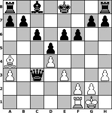 game notation in PGN-format [Event "unter uns Nr. 35 Altweibersommer"] [Site "www.myChess.de"] [Date "2016.08.26"] [Round "1"] [White "hape50"] [Black "Haneken"] [ECO "D00"] [WhitemyELO "1299"] [BlackmyELO "1049"] [Result "0-1"] [TimeControl "10/864000"] [WhiteDays "17"] [BlackDays "08"] [MyChessNo "104616"] 1. d4 d5 2. h3 e6 3. e3 Bb4+ 4. c3 Ba5 5. Nf3 Nf6 6. Qa4+ c6 7. Be2 Ne4 8. Ne5 Qb6 9. b4 Nxc3 10. Bd2 Nxa4 11. O-O f6 12. Nd3 Bxb4 13. Bd1 Na6 14. Bxb4 Nxb4 15. Nxb4 Qxb4 16. a3 Qb2 17. Bxa4 Qxa1 18. Nc3 Qxc3 0-1 position notation in FEN-format r1b1k2r/pp4pp/2p1pp2/3p4/B2P4/P1q1P2P/5PP1/5RK1 - kq - 0 19 Captured white pieces: ![]() ![]() ![]() ![]() ![]() ![]() ![]() ![]() ![]() ![]() ![]() ![]() ![]() ![]() ![]() Captured black pieces: ![]() ![]() ![]() ![]() ![]() ![]() ![]() ![]() ![]() ![]() ![]() ![]() ![]() ![]() ![]() Click on a captured piece in order to display the desired move!