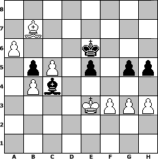 game notation in PGN-format [Event "2016"] [Site "www.myChess.de"] [Date "2016.01.01"] [Round "1"] [White "Master1"] [Black "hape50"] [ECO "D00"] [WhitemyELO "1255"] [BlackmyELO "1281"] [Result "1-0"] [TimeControl "10/2592000"] [WhiteDays "30"] [BlackDays "29"] [MyChessNo "101957"] 1. d4 d5 2. e3 h6 3. Bd3 Nf6 4. Nf3 e6 5. Nbd2 a6 6. O-O Bd6 7. Re1 O-O 8. e4 dxe4 9. Nxe4 Nxe4 10. Bxe4 Nd7 11. c4 Nf6 12. Bd3 Ng4 13. c5 Be7 14. h3 Nf6 15. Bf4 g5 16. Be5 c6 17. Bxf6 Bxf6 18. Bc4 Qc7 19. b4 b5 20. Bb3 Bb7 21. a4 Rad8 22. a5 Bc8 23. Ra2 Kg7 24. Rd2 Rfe8 25. Bc2 e5 26. dxe5 Bxe5 27. Nxe5 Rxd2 28. Qxd2 Rxe5 29. Qd4 f6 30. Rxe5 Qxe5 31. Qxe5 fxe5 32. Be4 Bd7 33. f3 Kf6 34. Kf2 Bf5 35. Bxc6 h5 36. Bb7 Bd3 37. Bxa6 Ke6 38. g3 Kd5 39. Ke3 Bc4 40. Bb7+ Ke6 41. a6 1-0 position notation in FEN-format 8/1B6/P3k3/1pP1p1pp/1Pb5/4KPPP/8/8 - - - 0 41 Captured white pieces: Captured black pieces: Click on a captured piece in order to display the desired move!