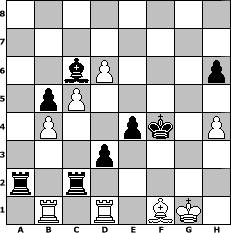game notation in PGN-format [Event "Tigran (Wartanowitsch)Petrosjan Turnier"] [Site "www.myChess.de"] [Date "2009.08.09"] [Round "1"] [White "freizeitspieler"] [Black "martinus"] [ECO "E61"] [WhitemyELO "1562"] [BlackmyELO "1834"] [Result "0-1"] [TimeControl "10/2592000"] [WhiteDays "137"] [BlackDays "146"] [MyChessNo "58142"] 1. d4 Nf6 2. c4 g6 3. Nc3 Bg7 4. Nf3 c5 5. d5 d6 6. h3 O-O 7. e4 Qa5 8. Bd2 Nbd7 9. Qc2 Re8 10. Be2 a6 11. O-O Qc7 12. a3 e6 13. Rab1 exd5 14. exd5 Ne5 15. Nxe5 dxe5 16. Bd3 Bd7 17. Rfe1 b5 18. b3 Rab8 19. Ne4 Nxe4 20. Bxe4 f5 21. Bf3 e4 22. Be2 Bd4 23. Bc3 Qf4 24. Bxd4 cxd4 25. Qc1 Qd6 26. Bf1 Kg7 27. Qb2 Qf6 28. c5 Rbd8 29. d6 a5 30. b4 d3 31. Qd2 axb4 32. axb4 Ra8 33. g3 Ra3 34. h4 h6 35. Rec1 Bc6 36. Re1 Rea8 37. Qb2 Ra2 38. Qxf6+ Kxf6 39. Red1 R8a3 40. Bh3 Rc2 41. Bf1 Raa2 42. f3 Ke5 43. g4 Kf4 44. gxf5 gxf5 45. fxe4 fxe4 0-1 position notation in FEN-format 8/8/2bP3p/1pP5/1P2pk1P/3p4/r1r5/1R1R1BK1 - - - 0 46 Captured white pieces: Captured black pieces: Click on a captured piece in order to display the desired move!